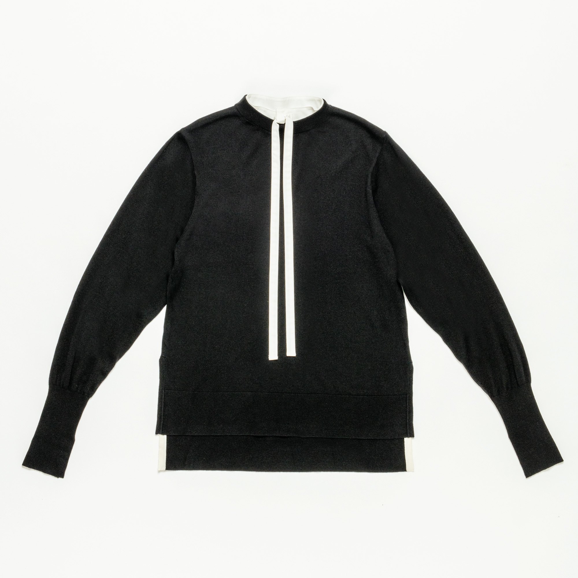 そのまま垂らすスタイルはもちろん、前でリボン結びにしたり、後で結んで立ち襟のように使ったりと、3通りのアレンジが可能。甘辛それぞれ楽しめるボウタイだからこそ自由に楽しんで。