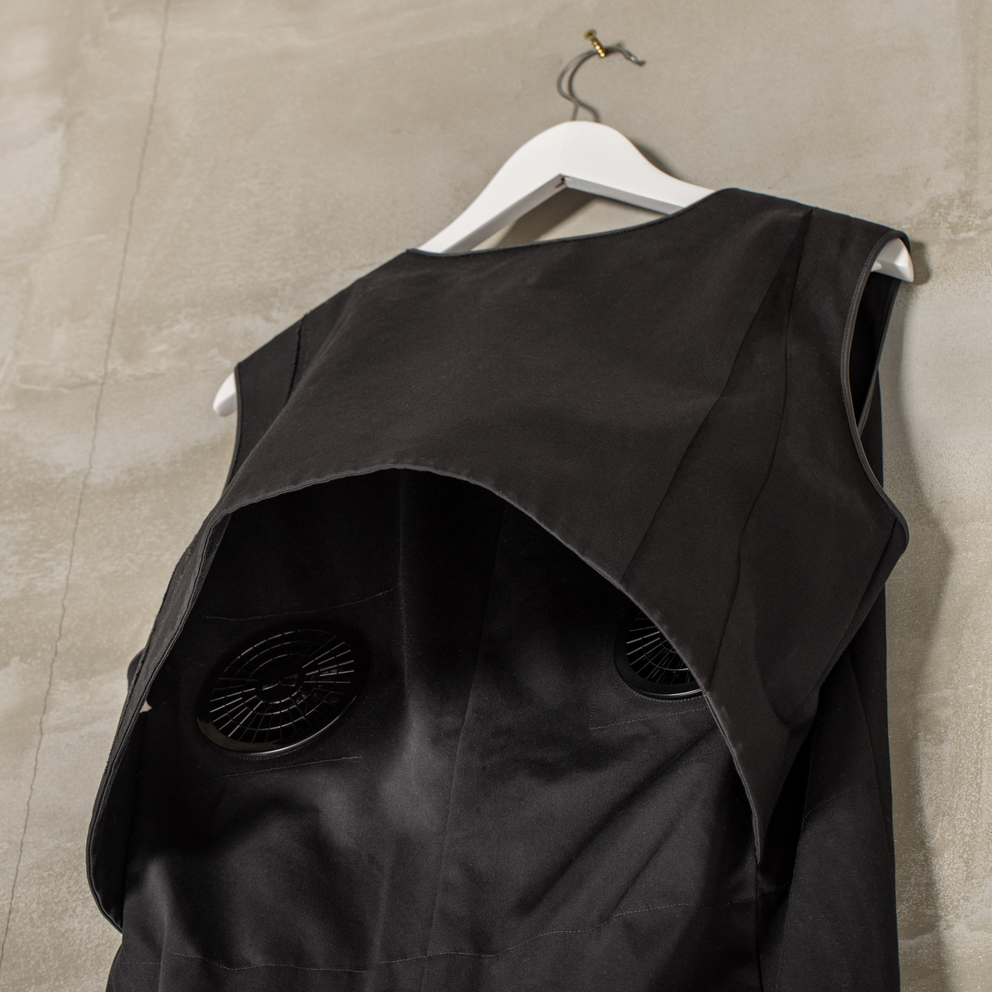 背中に装着したスマートな送風機能。汗の気化熱を発生させ、体温を効率的に下げることで猛暑でも快適に過ごせます。ファンは、ワンタッチで着脱可能です。