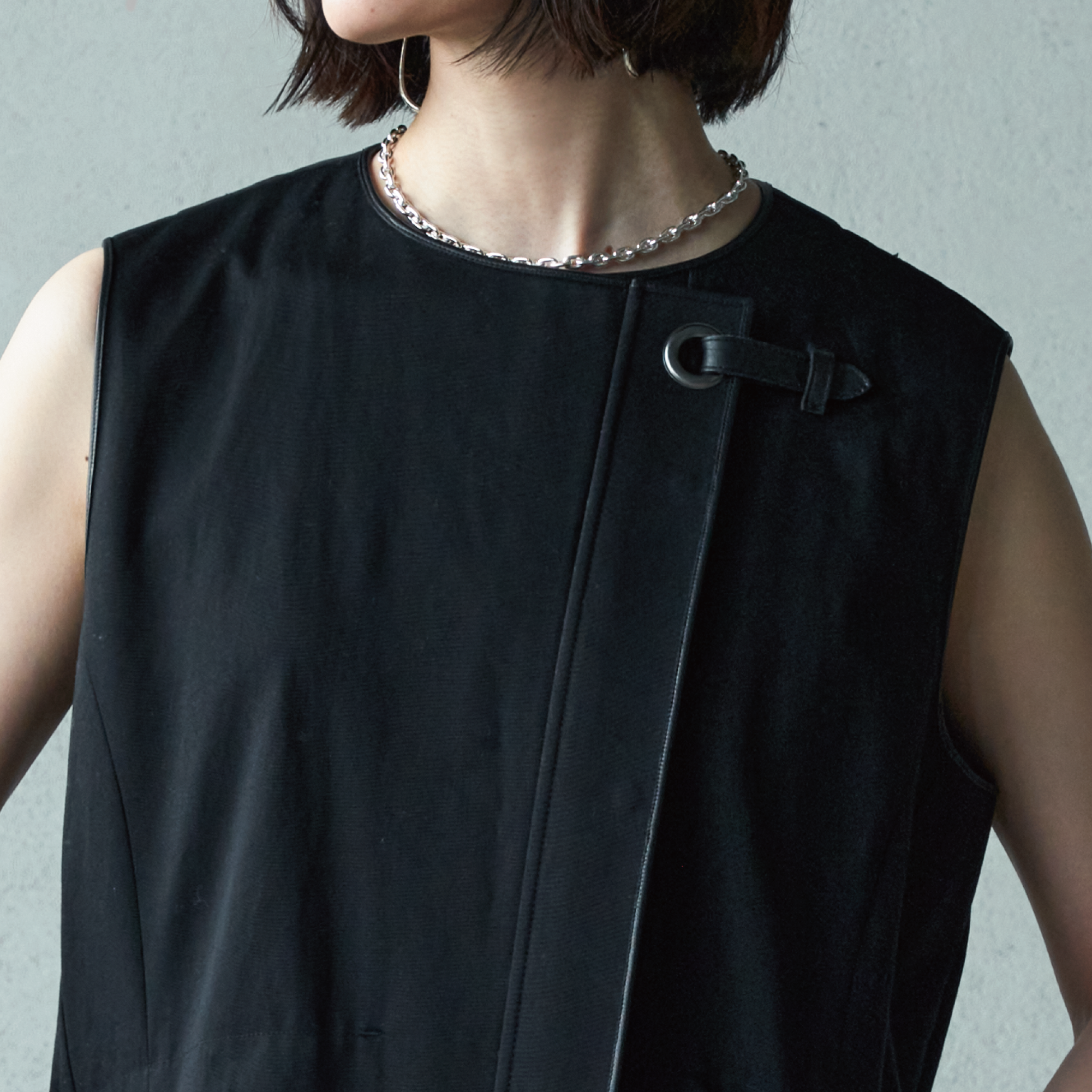 アシンメトリーなデザインと、本革のパイピングや胸元のベルト、立体的なフォルムを描くヨークがボディラインを美しく見せてくれます。