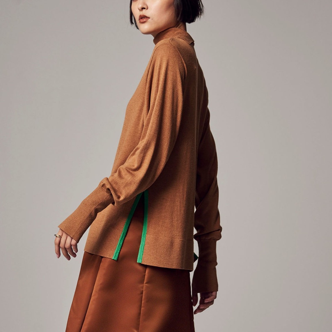 袖口に向かってだんだんと細くなるドルマンスリーブは、二の腕まわりのシルエットは拾わず手首を細さを強調してスッキリと見せます。また、高混率なシルクに上質なウールを掛け合わせ、肌ざわりはもちろん、軽さと暖かさのバランスもちょうどいいニットに。