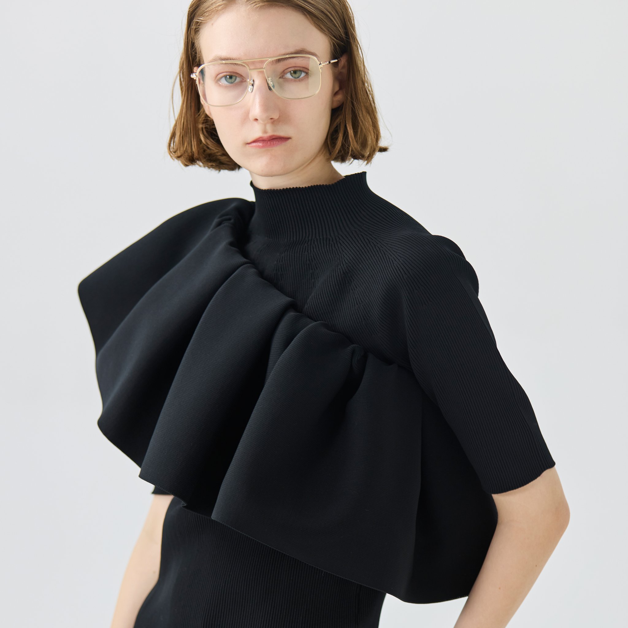 別付けのケープは自在にアレンジ可能で、トップス単体でミニマルにも着られます。