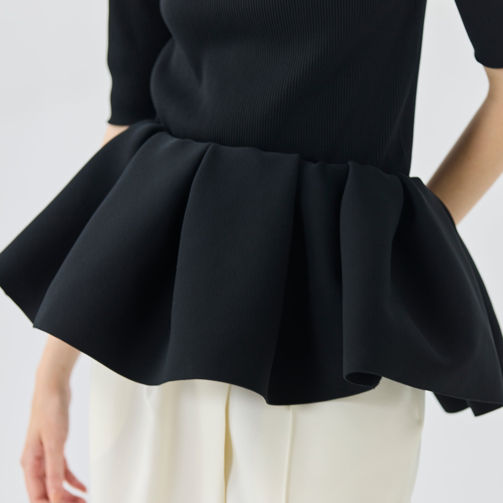 五分袖は細すぎず太すぎずの絶妙なバランスで、二の腕をすっきり見せ、アウターの袖にも干渉しにくく、端境期から春まで長く活躍します。着丈はやや長めで、タックインしてももたつかず、スマートな印象をキープ。