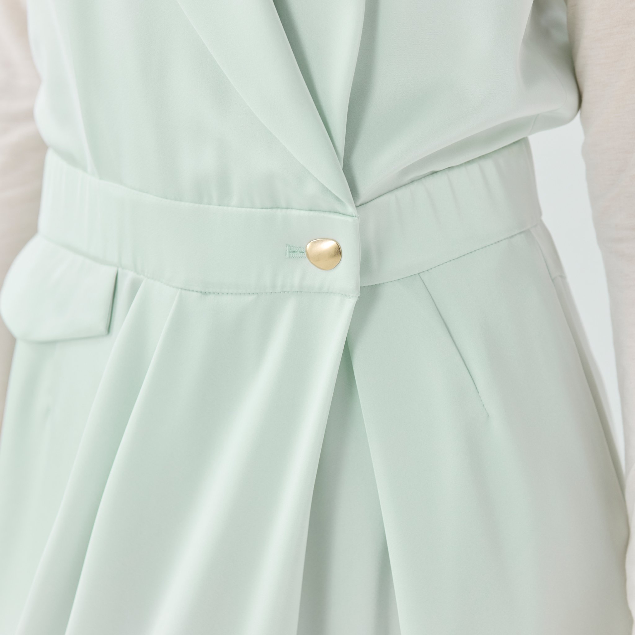 カラーは、サテンの光沢が際立つブラック、ベージュ、ミントグリーンの3色展開。ヒーターウェアとしても、インナーパンツを外して軽やかに着こなしても楽しめる、大人のワードローブを格上げするジャンプスーツです。