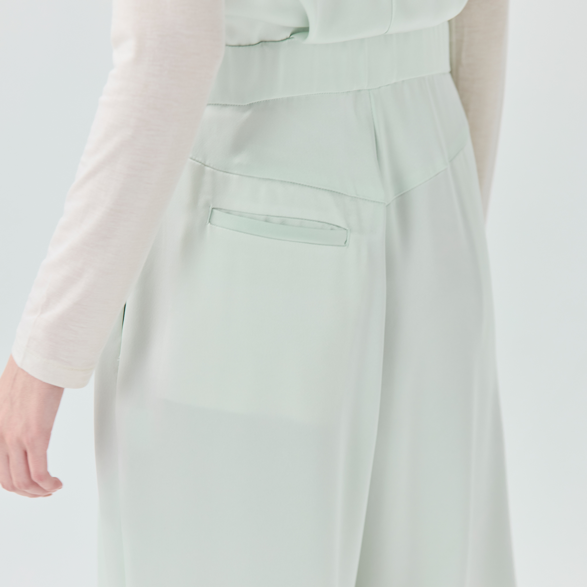 立体的な肩のラインは、誠実さやきちんと感を纏わせながら、華奢見えも叶えます。裏地で表地を吊る設計と、前後2本ずつのタックによる自然なブラウジングで、上質で美しいシルエットに仕上げました。ウエストは、ベルト内にゴムを仕込んだ“ナチュラルストレッチ”仕様。エレガントな見た目を保ちながら、快適な着心地を実現します。