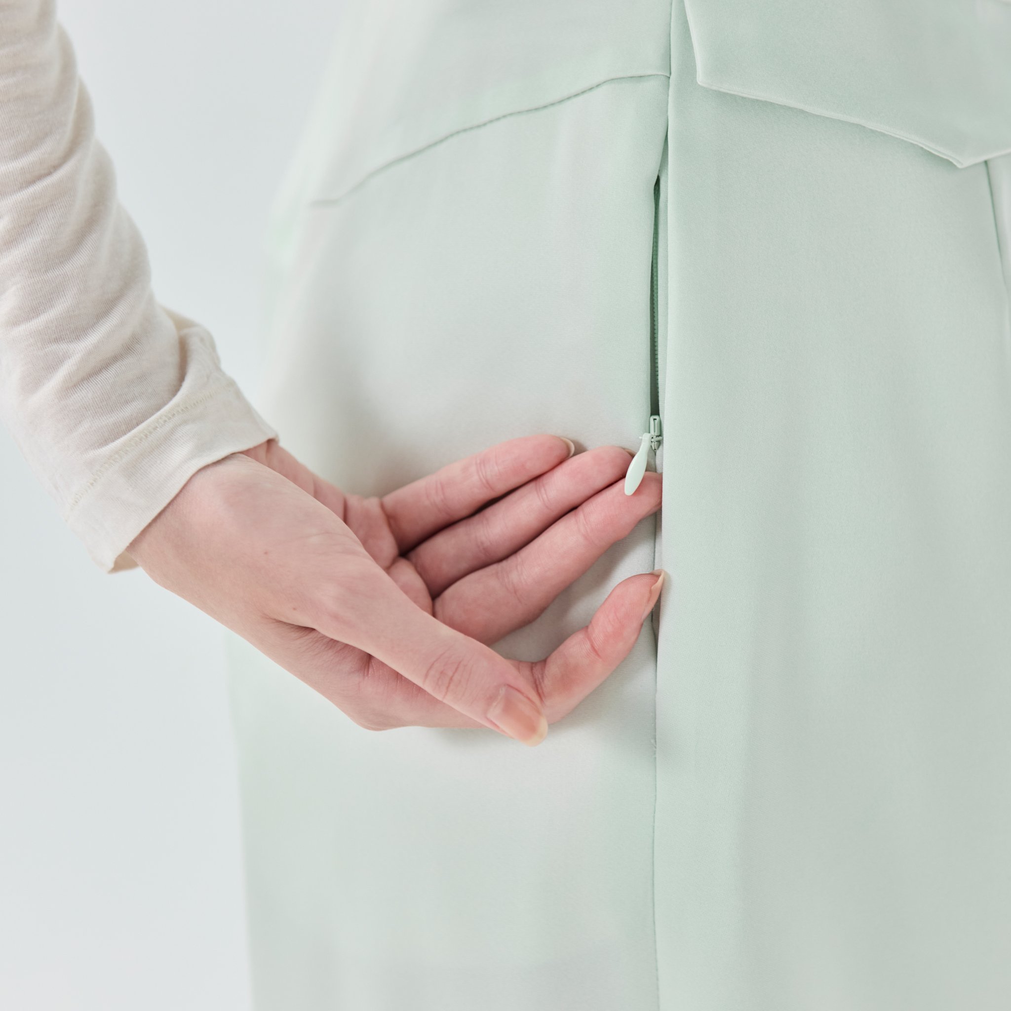 素材にはトリアセテート×ポリエステルのダブルサテンを採用。なめらかでふくらみのあるタッチに加え、シルクのような光沢が高級感を漂わせます。シワになりにくくはっ水加工も施されているため、長時間の着用や出張・旅行でも美しさをキープ。手洗い可能でケアも簡単です。また、帯電を抑える放電テープを採用。衣服のこすれによる静電気を減らし、不快な静電気のショックを抑えます。スカートやスラックスのまとわりつきを起きにくくし、花粉やホコリの付着も抑えます。